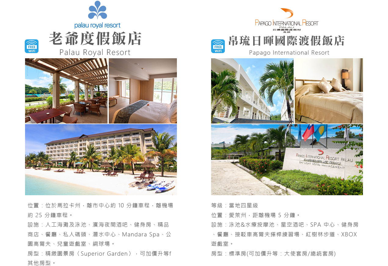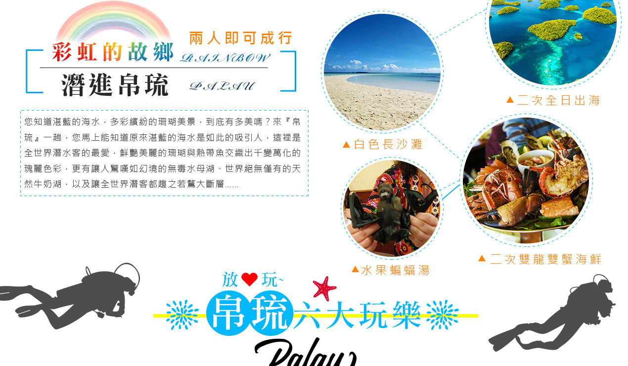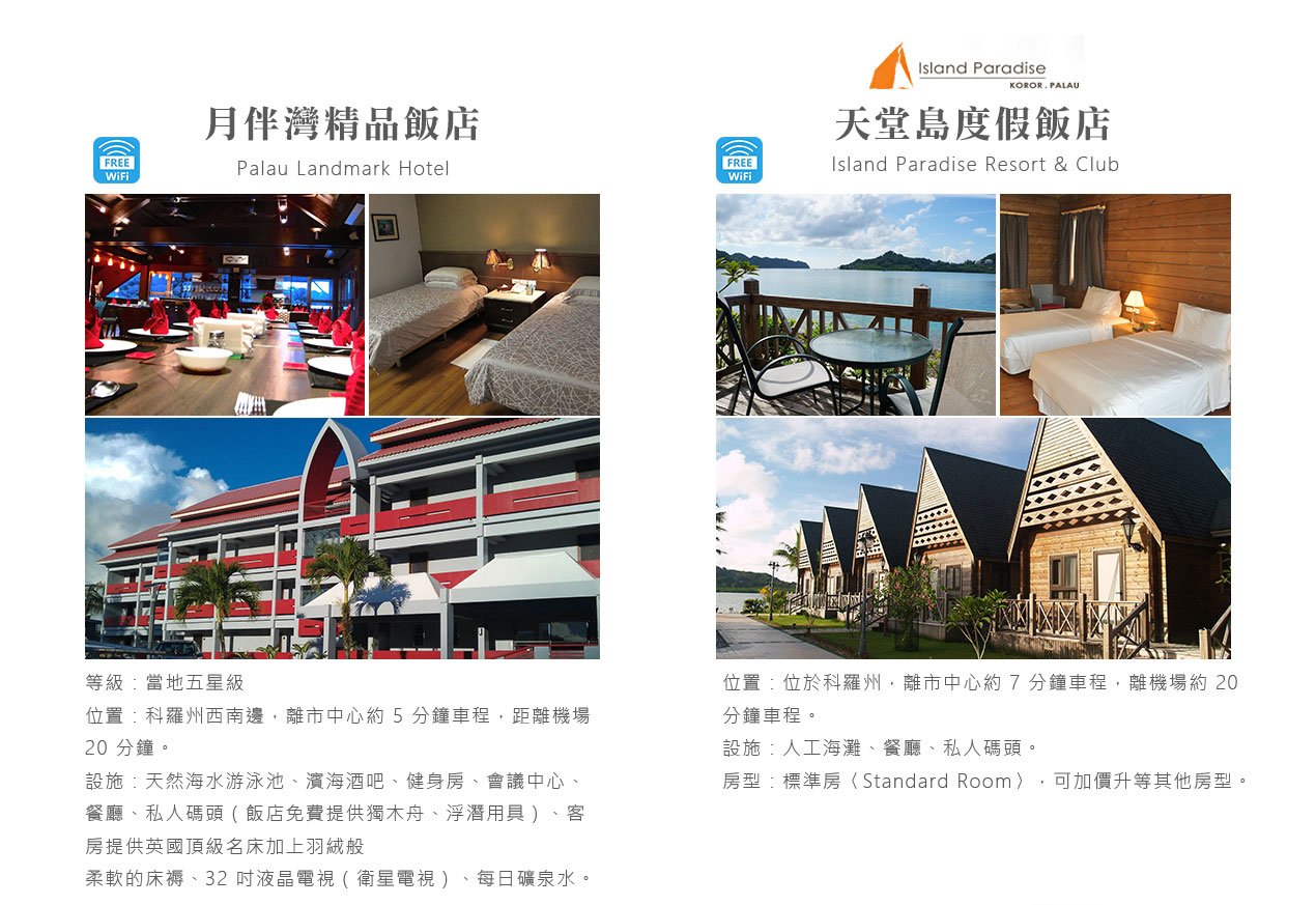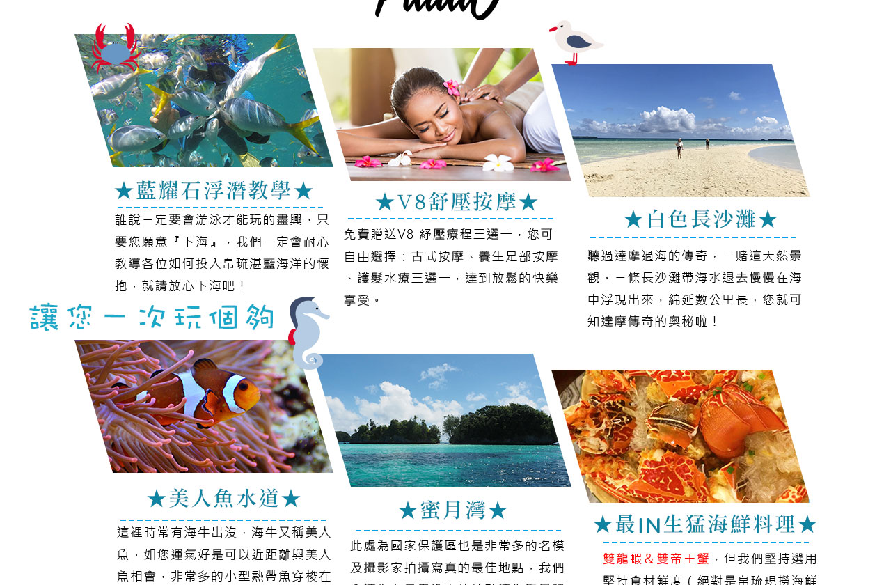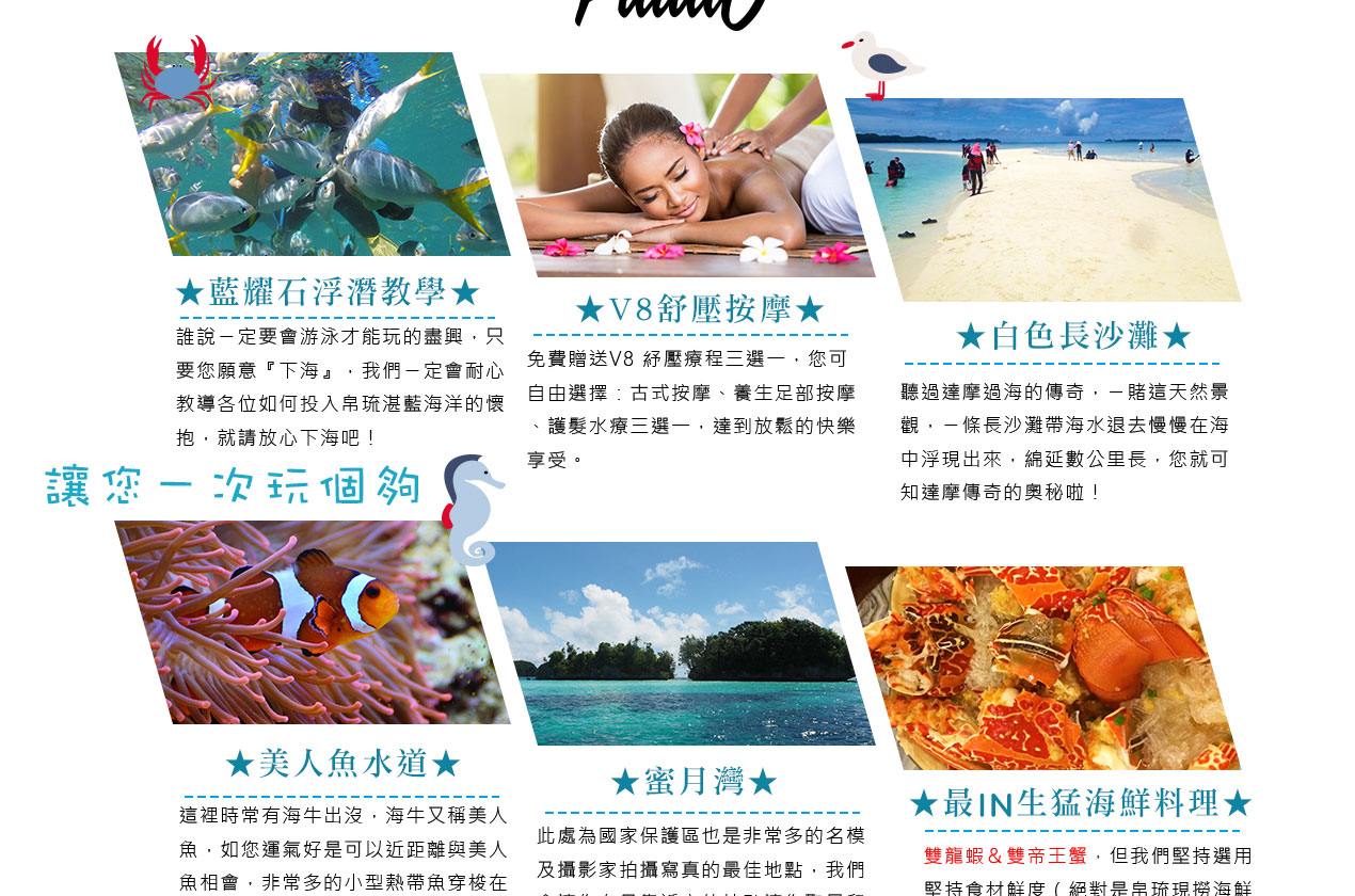 搭乘快艇前往藍耀石沙灘,首先由專業又熱情的導遊親切的教導如何正確使用浮潛裝備及水上安全事項,就算怕水或是不會游泳的你也能輕鬆自在快樂的浮潛,您可以放鬆心情在此練習浮潛或者愜意的在島上漫步拍照,等待我們精心為您準備的無人島原始海陸BBQ午餐。特別安排日式餐盒及幾樣現烤的海陸料理以及現煮的美味鮮魚湯。雖然不是甚麼高檔佳餚,也沒有華麗的擺盤,但能在藍天闢海蒼穹的無人島享用午餐,肯定是一種難以忘懷的體驗。餐後續搭乘快艇穿梭在藍天碧海中青蔥的小島,撒落在藍色海洋當中,就想一顆顆綠色珍珠一般,構成了美麗的《海洋花園》奇景。硬珊瑚公園是一處可見到底但踩不到底的浮潛地點,可以看到一片由硬珊瑚組成的海域,往較深的地方信運的話還可能發現俗稱蘇美魚的《龍王鯛》,也就是帛琉的國寶魚。再前往軟瑚瑚區,以浮潛方式,即可看到五彩繽紛的軟珊瑚,隨著海浪搖曳生姿,依附著岩壁而生。玫瑰珊瑚公園:壯麗珊瑚呈玫瑰形狀,格外的巨大且艷麗,並有熱帶魚群穿梭其間,嬉戲追逐,還可將吃剩下的BBQ,輕握手中享受魚群爭食的快樂;腦紋石珊瑚是一個個奇特的腦紋珊瑚附著在海底斷層上,真是美不勝收;最後前往山中湖,親眼目賭第二次世界大戰被擊沈的船艦殘骸,記錄著歷史的遺跡。在一連串美麗的海洋花園浮潛活動當中,讓各位貴賓大為讚嘆原來海景的美景更勝於陸地景觀,在意猶未盡的同時,我們返航的時間也悄悄的到來,乘著微風,快艇駛往碼頭,結速了這美妙的一天。暢快淋漓沐浴之後,隨後我們前往帛琉當地餐館享用生猛的雙龍蝦V.S雙螃蟹超級海鮮大餐,每桌均為您呈上帛琉本港的生猛龍蝦及紅樹林螃蟹,絕非一般餐館的冷凍進口龍蝦及螃蟹所能取代,並讓您有機會品嚐到當地最有名,且是愛美女性最愛的【水果美容蝙蝠湯】喔!再加上各式各樣的海鮮佳餚,保證讓您補足今日所有體力,讓您再次生龍活虎。華燈初上,今晚特別為您準備了帛琉獨特的舒療按摩三十分鐘,好好為您放鬆緊繃的全身筋骨,讓您ㄧ夜好眠,期待明日精采的海洋之旅續集。