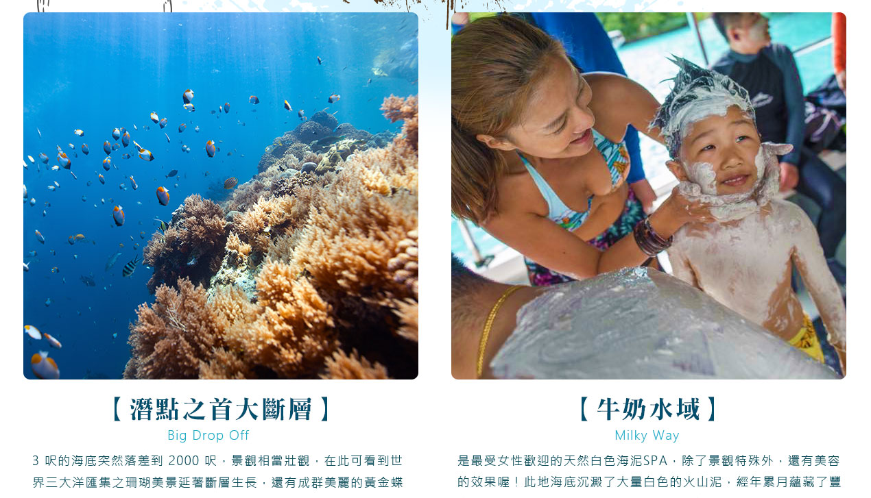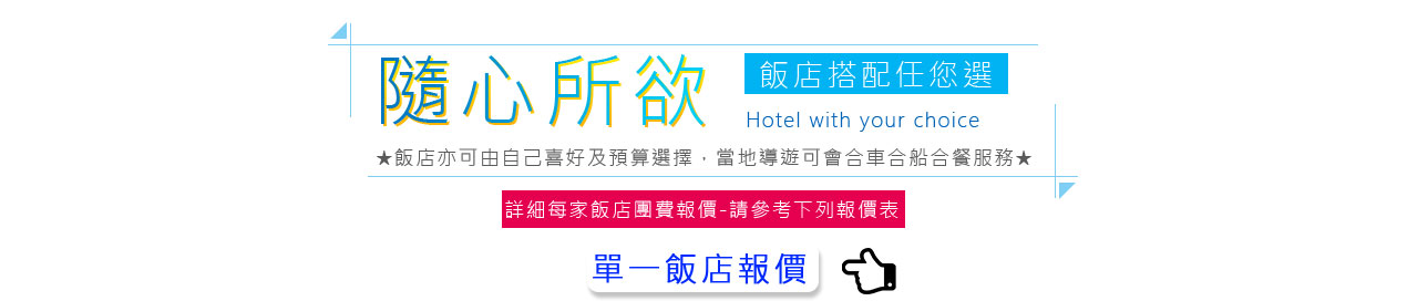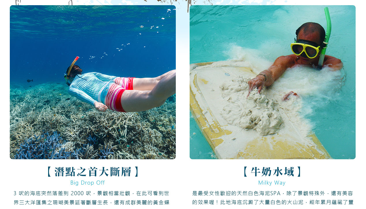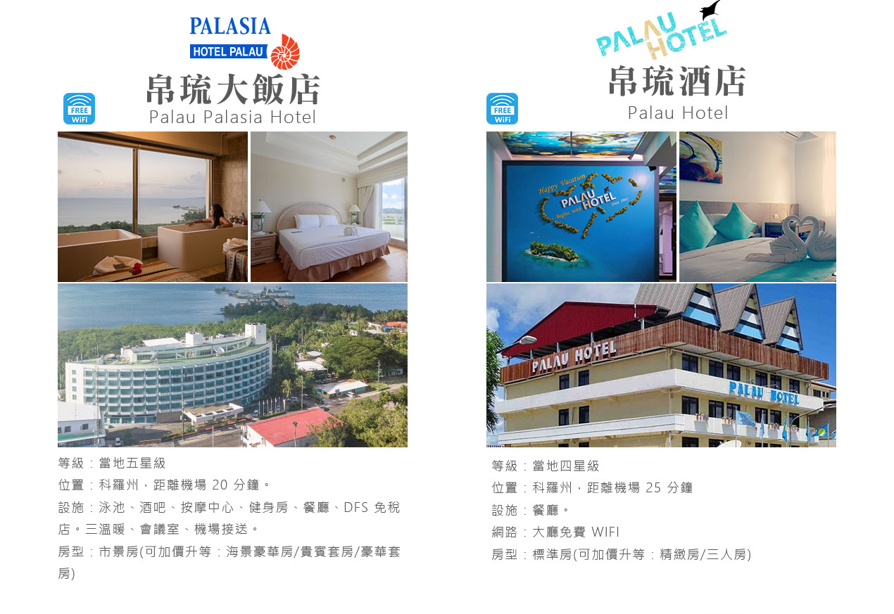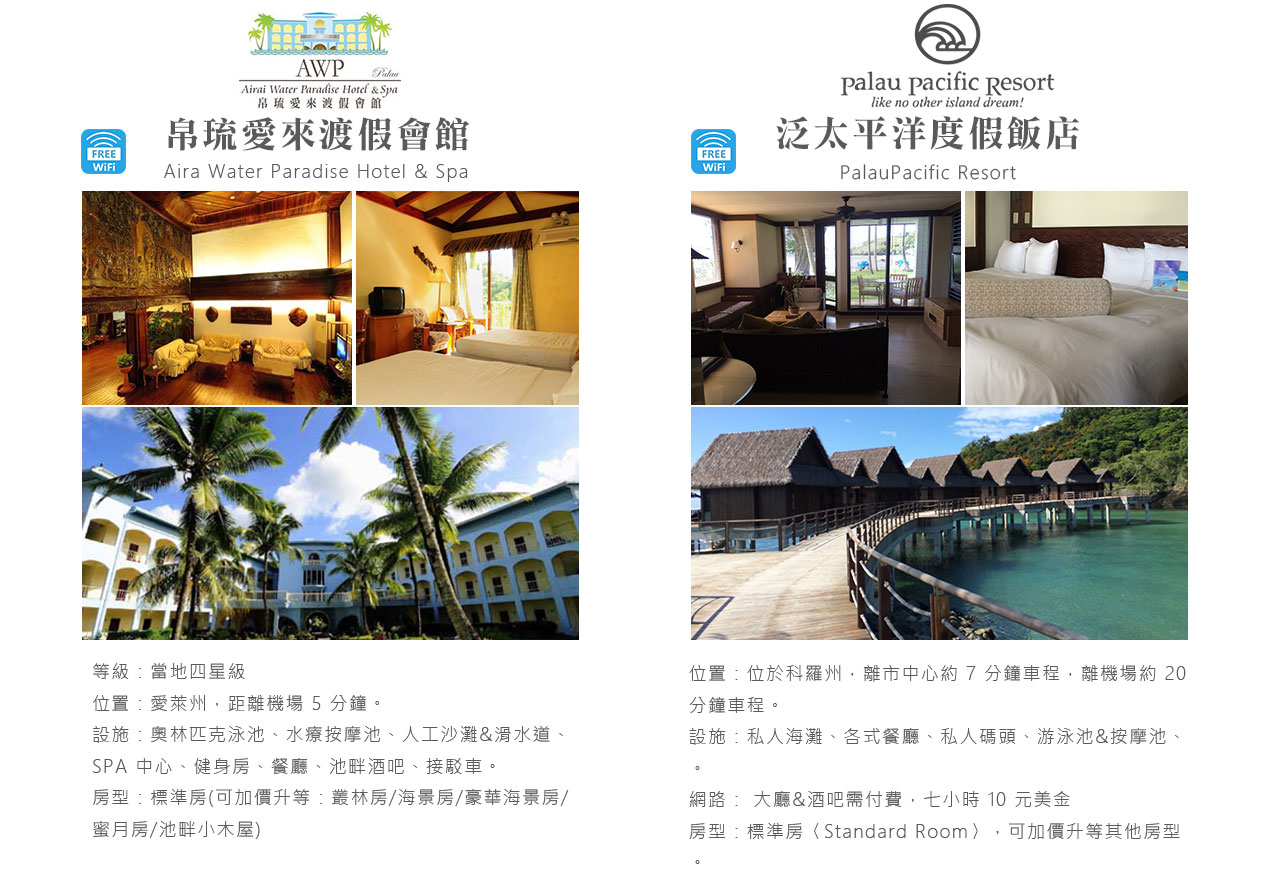 搭乘快艇前往藍耀石沙灘,首先由專業又熱情的導遊親切的教導如何正確使用浮潛裝備及水上安全事項,就算怕水或是不會游泳的你也能輕鬆自在快樂的浮潛,您可以放鬆心情在此練習浮潛或者愜意的在島上漫步拍照,等待我們精心為您準備的無人島原始海陸BBQ午餐。特別安排日式餐盒及幾樣現烤的海陸料理以及現煮的美味鮮魚湯。雖然不是甚麼高檔佳餚,也沒有華麗的擺盤,但能在藍天闢海蒼穹的無人島享用午餐,肯定是一種難以忘懷的體驗。餐後續搭乘快艇穿梭在藍天碧海中青蔥的小島,撒落在藍色海洋當中,就想一顆顆綠色珍珠一般,構成了美麗的《海洋花園》奇景。硬珊瑚公園是一處可見到底但踩不到底的浮潛地點,可以看到一片由硬珊瑚組成的海域,往較深的地方信運的話還可能發現俗稱蘇美魚的《龍王鯛》,也就是帛琉的國寶魚。再前往軟瑚瑚區,以浮潛方式,即可看到五彩繽紛的軟珊瑚,隨著海浪搖曳生姿,依附著岩壁而生。玫瑰珊瑚公園:壯麗珊瑚呈玫瑰形狀,格外的巨大且艷麗,並有熱帶魚群穿梭其間,嬉戲追逐,還可將吃剩下的BBQ,輕握手中享受魚群爭食的快樂;腦紋石珊瑚是一個個奇特的腦紋珊瑚附著在海底斷層上,真是美不勝收;最後前往山中湖,親眼目賭第二次世界大戰被擊沈的船艦殘骸,記錄著歷史的遺跡。在一連串美麗的海洋花園浮潛活動當中,讓各位貴賓大為讚嘆原來海景的美景更勝於陸地景觀,在意猶未盡的同時,我們返航的時間也悄悄的到來,乘著微風,快艇駛往碼頭,結速了這美妙的一天。暢快淋漓沐浴之後,隨後我們前往帛琉當地餐館享用生猛的雙龍蝦V.S雙螃蟹超級海鮮大餐,每桌均為您呈上帛琉本港的生猛龍蝦及紅樹林螃蟹,絕非一般餐館的冷凍進口龍蝦及螃蟹所能取代,並讓您有機會品嚐到當地最有名,且是愛美女性最愛的【水果美容蝙蝠湯】喔!再加上各式各樣的海鮮佳餚,保證讓您補足今日所有體力,讓您再次生龍活虎。華燈初上,今晚特別為您準備了帛琉獨特的舒療按摩三十分鐘,好好為您放鬆緊繃的全身筋骨,讓您ㄧ夜好眠,期待明日精采的海洋之旅續集。