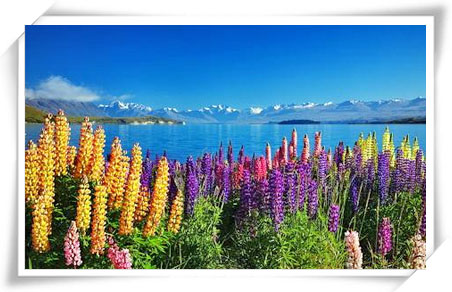 普卡基湖 Lake Pukaki,藍色湖水中映入夢幻色彩,稱為「土耳其藍色湖」-冰河遺留下的冰磧石堆積所形成的偃塞湖,水源來自塔斯曼等數條冰河融化後所形成的塔斯曼河。冰河夾帶的粉末雜質,將湖水調成有如加了濃濃牛奶的藍綠夢幻色彩,終年積雪的山脈環繞,營造出有如香格里拉般的仙境世界,成為魔戒電影中迷人的拍攝場景。