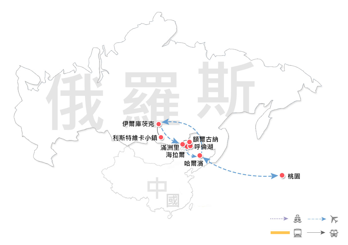 | 伊爾庫茨克 (約二小時航班待告)/滿州里(國門景區、火車頭廣場、中俄民貿商城、猛瑪象公園、遠觀套娃廣場) |