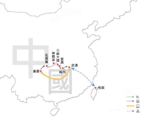 | 長江三峽(茅坪碼頭下船)-0.5H三峽大壩景區-1H宜昌-1.5H荊州(古城牆+登樓)-3.5H武漢 |