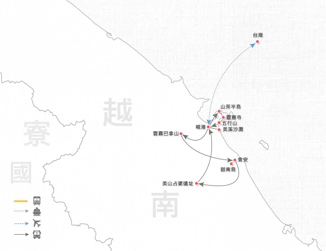 | 會安 > 美山聖地~占婆遺址 > 峴港 > VIET SENSE下午茶含三明治+咖啡(穿奧黛服拍照) > 粉紅大教堂 > 漢市場 > 美溪沙灘 |
